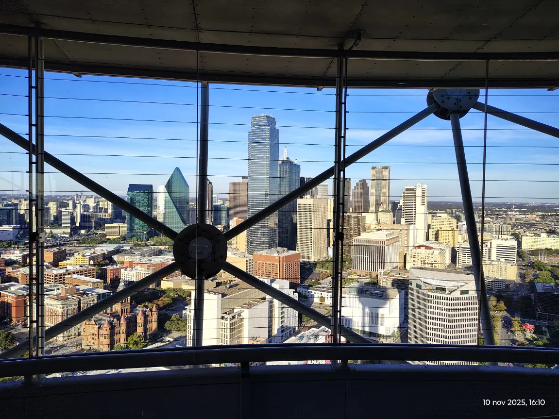 Daarna ging ik naar Reunion Tower. De lift bracht me in enkele seconden naar boven, waar ik een 360° uitzicht kreeg over de stad. Pas daarboven vielen de puzzelstukjes van Dallas in elkaar: de skyline, de wijken, het ritme van de stad en plots kreeg alles veel meer context.