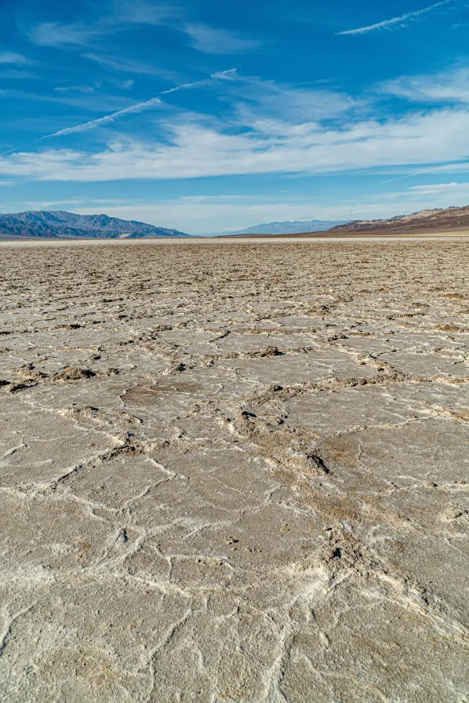 Via Furnace Creek vervolgde ik mijn route naar het laagste punt van Noord-Amerika. Badwater Basin is een surrealistische ervaring: wandelen over een eindeloze witte zoutvlakte, met de bergen als muren aan de horizon. De lucht trilt er, de grond kraakt onder je voeten en alles voelt buitenaards.