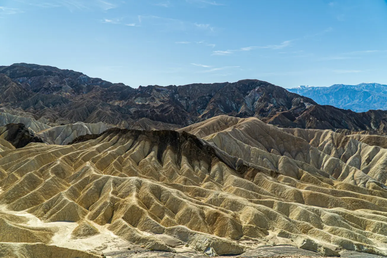 Daarna reed ik verder naar Zabriskie Point, een plek die eruitziet alsof de aarde in zachte golven is gevouwen. De okerkleurige heuvels lijken bijna vloeibaar, alsof ze nog maar net gestold zijn. Ik bleef er lang staan, luisterend naar het niets. De soort stilte die je zelden nog vindt.